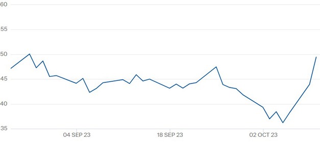 TTF gasspriskontrakt «november 2023» til 10. oktober 2023. Klikk her for en forstørrelse og de siste tallene.