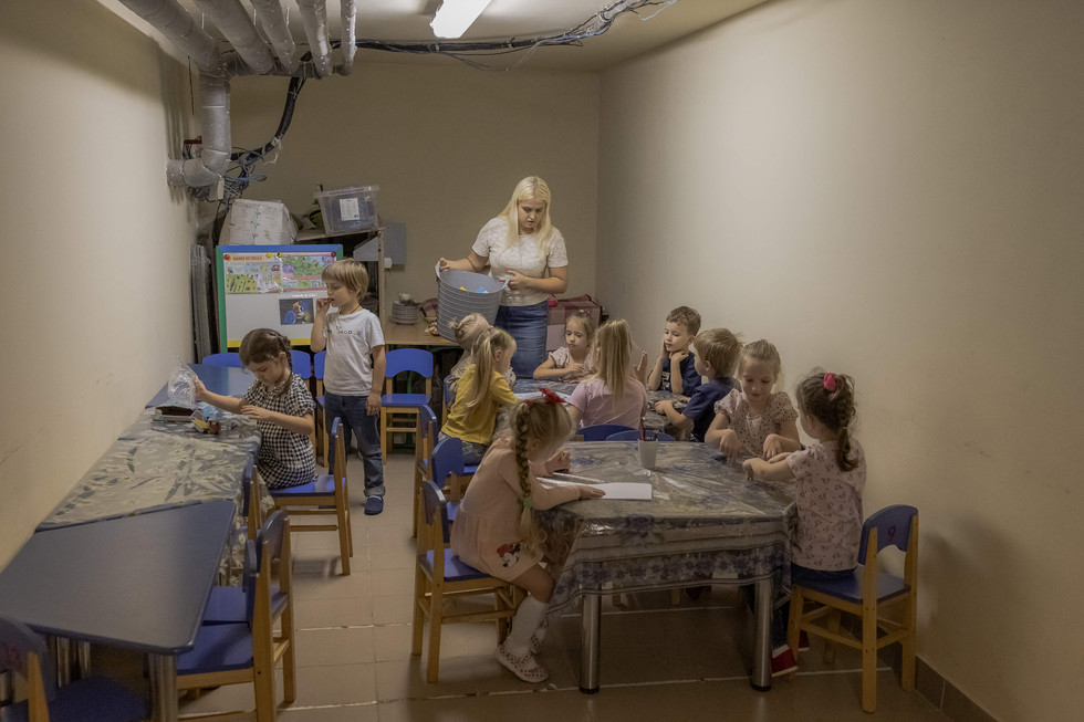 Roman Pilipey / AFP – Andre steder i Ukraina må barn ofte søke ly fra luftangrep. 14. september 2023, i den sør-ukrainske byen Kryvyi Rih, tok en gruppe fra en barnehage tilflukt i en kjeller.